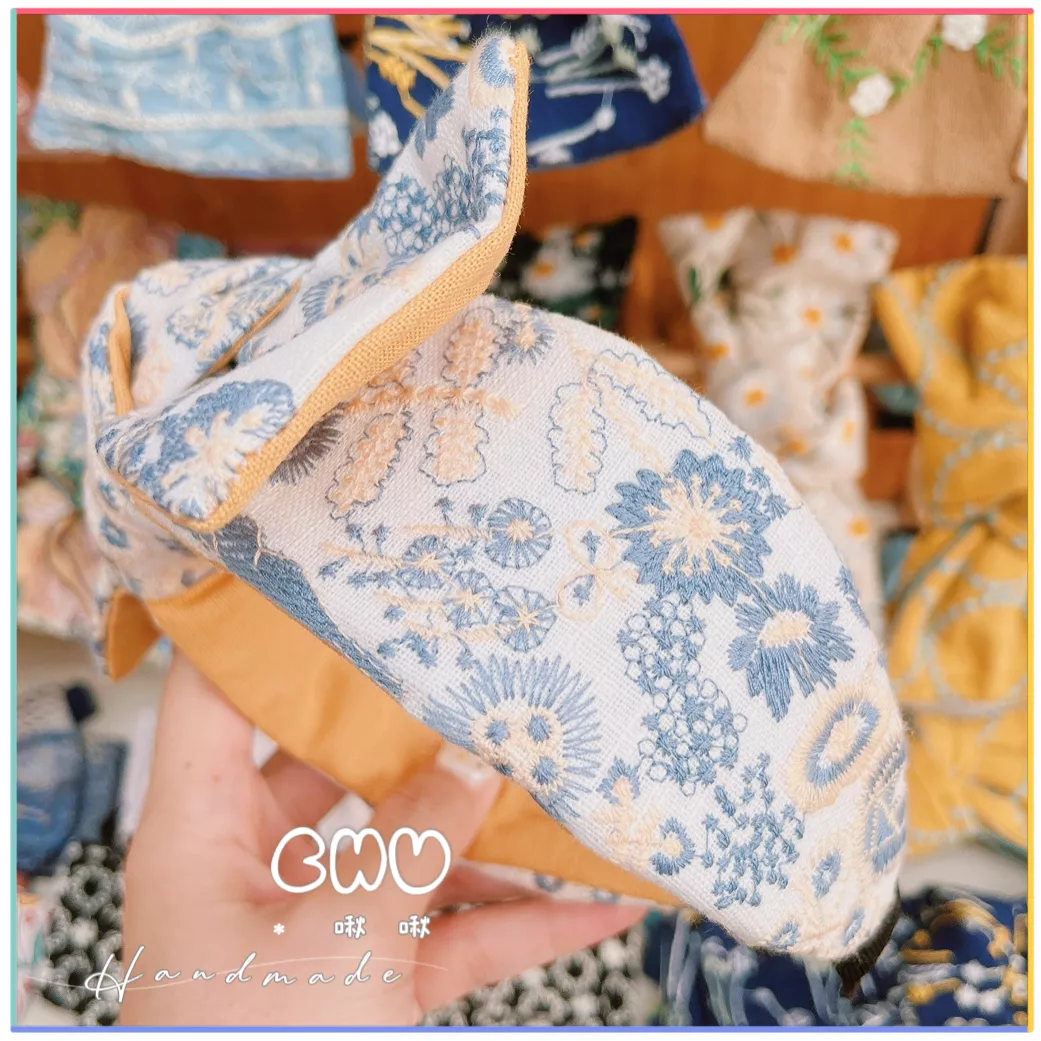 刺繡款|藍色花朵|寬版 蝴蝶結 髮箍