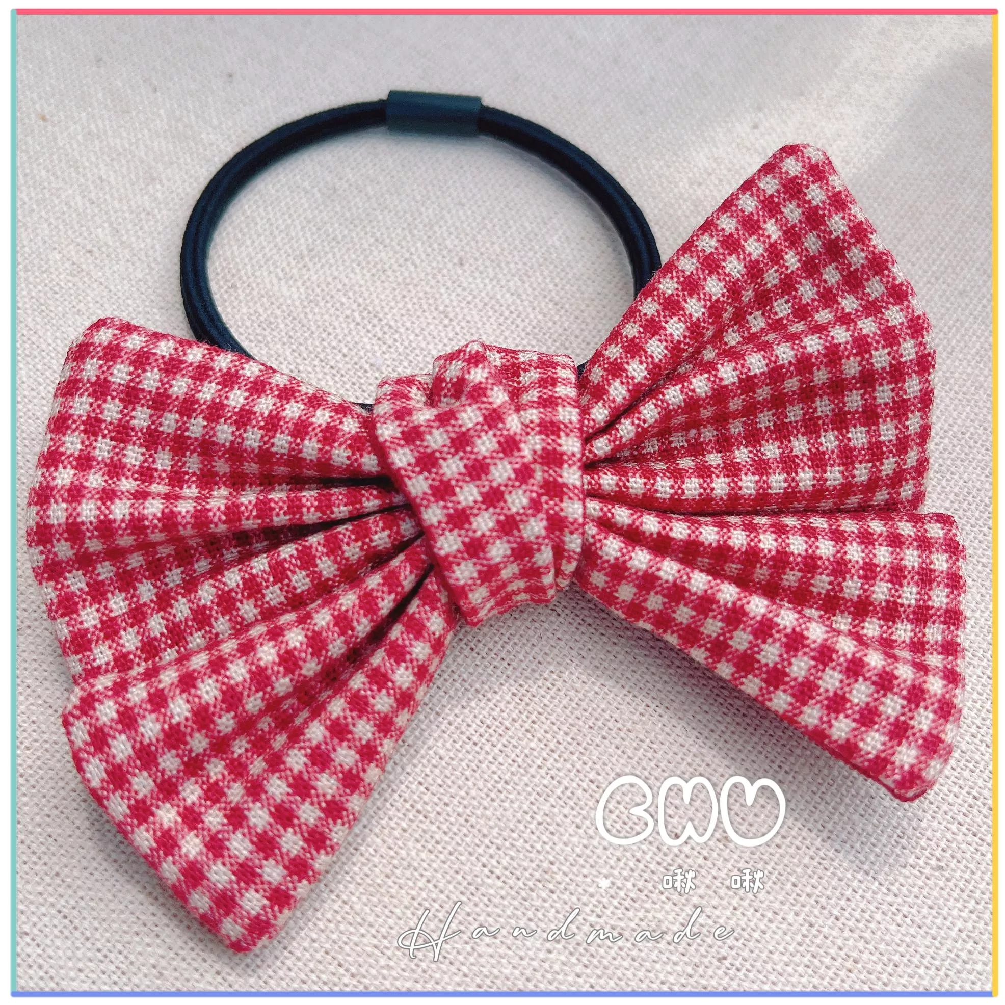紅色小格紋|蝴蝶結髮圈
