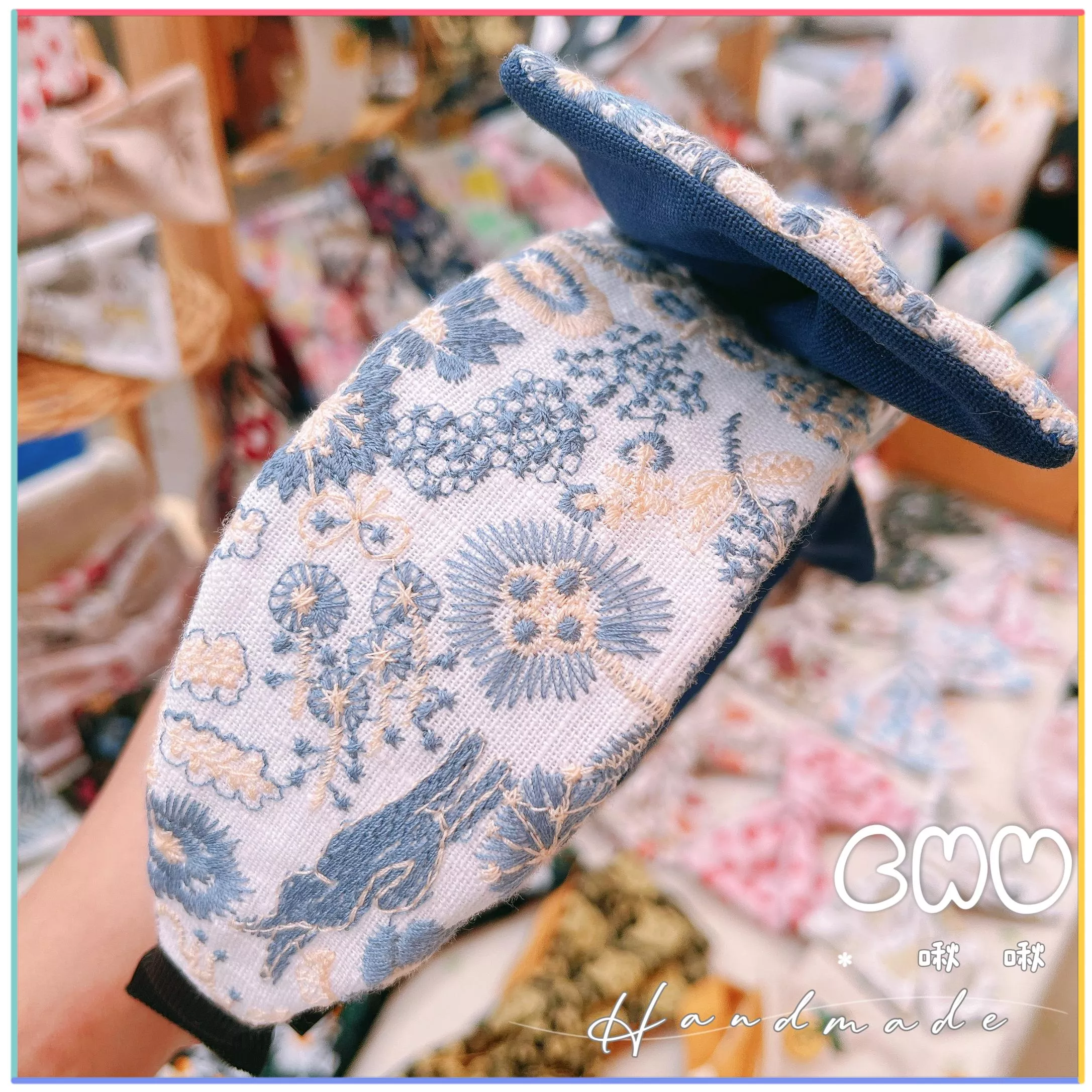 刺繡款|小仙女 (內襯深藍)|寬版 蝴蝶結髮箍