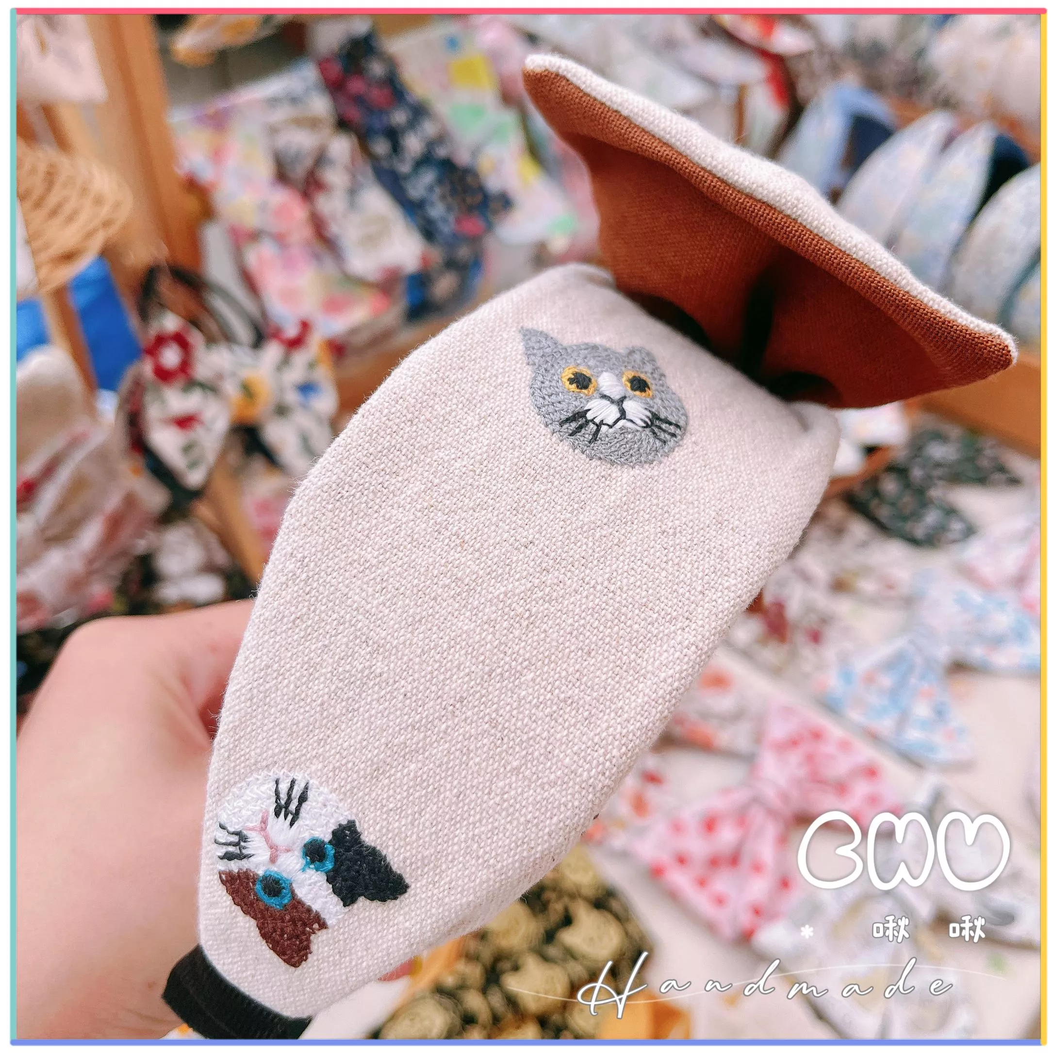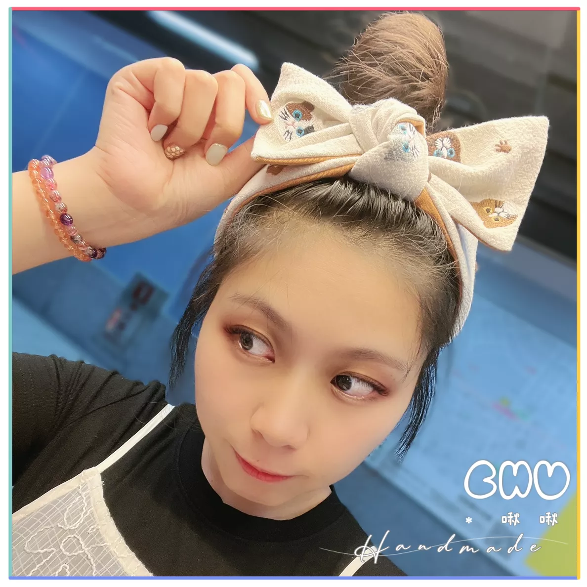 刺繡款|貓貓(米色➕咖啡)|寬版 蝴蝶結髮箍