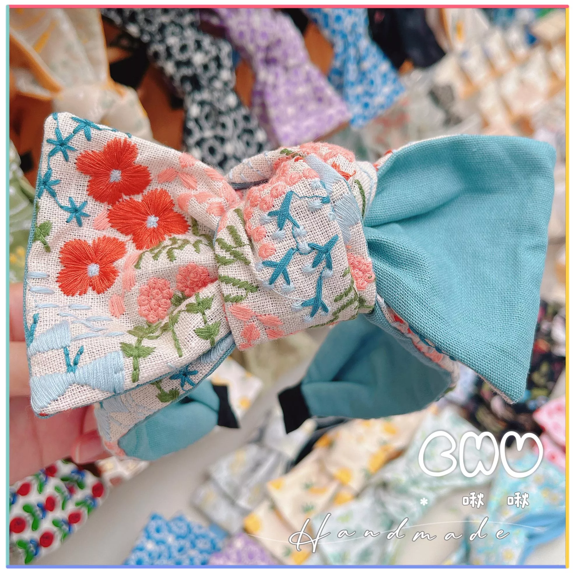 刺繡款|橘色花花(湖水藍)|寬版 蝴蝶結髮箍