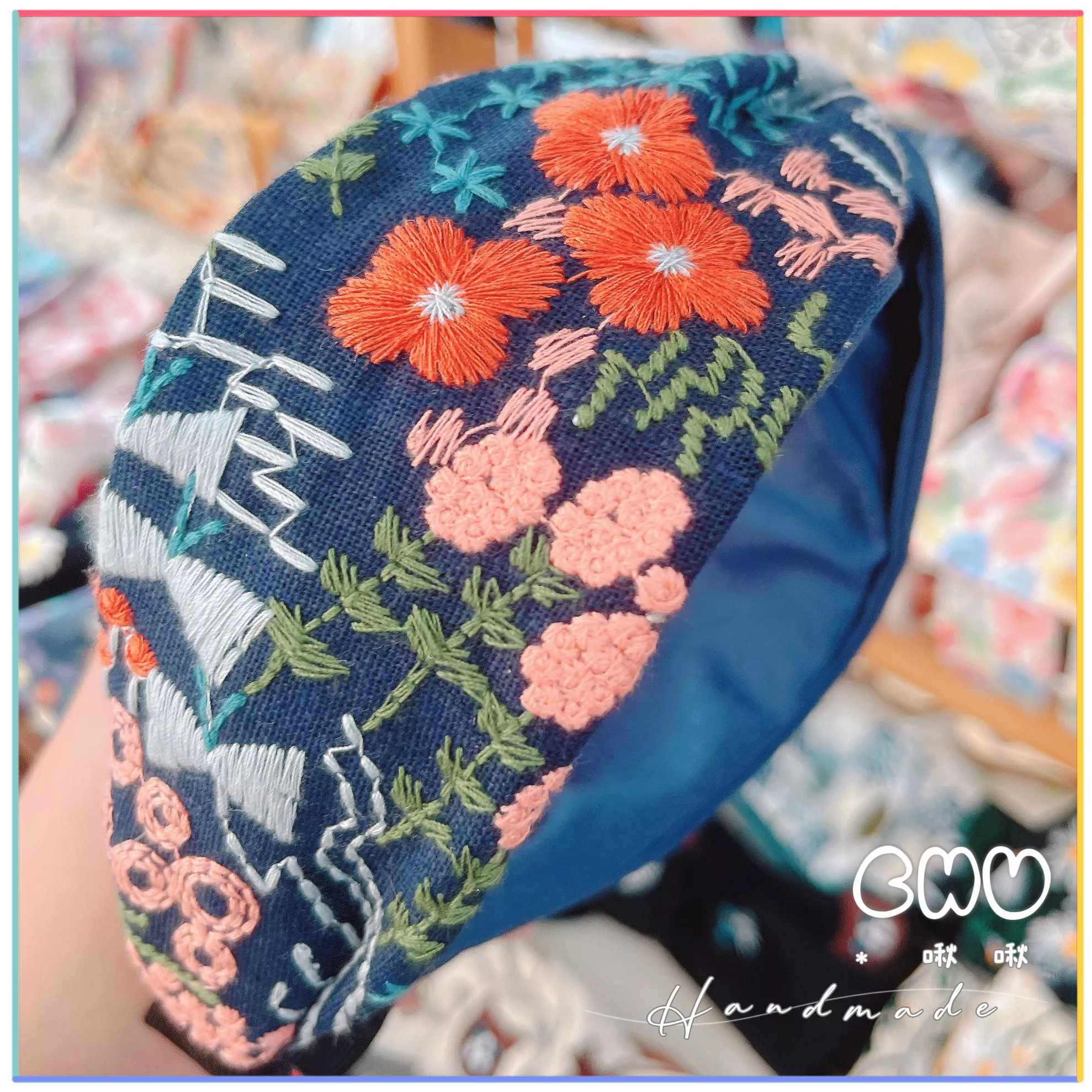 刺繡款|橘色花花(深藍)|寬版 交叉髮箍