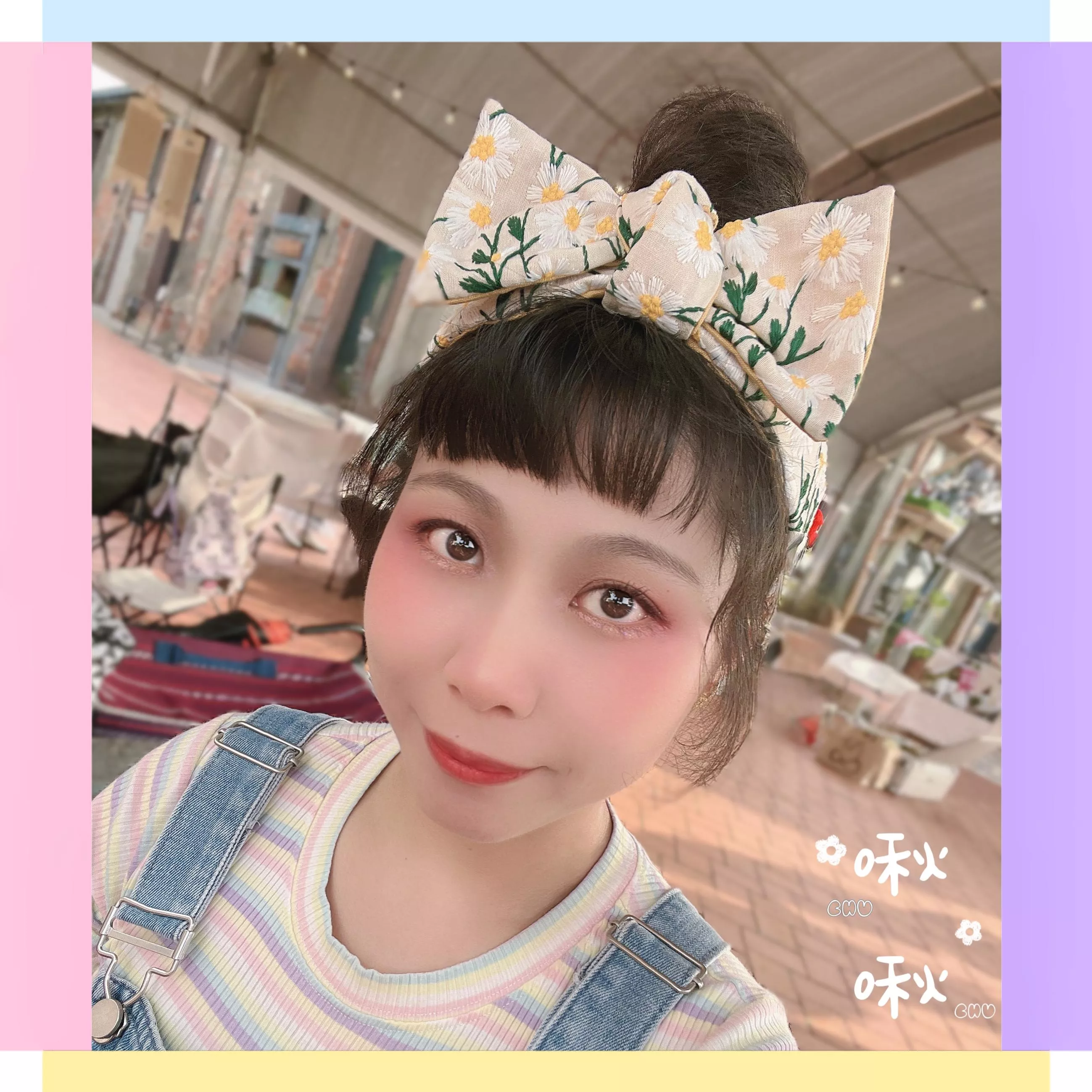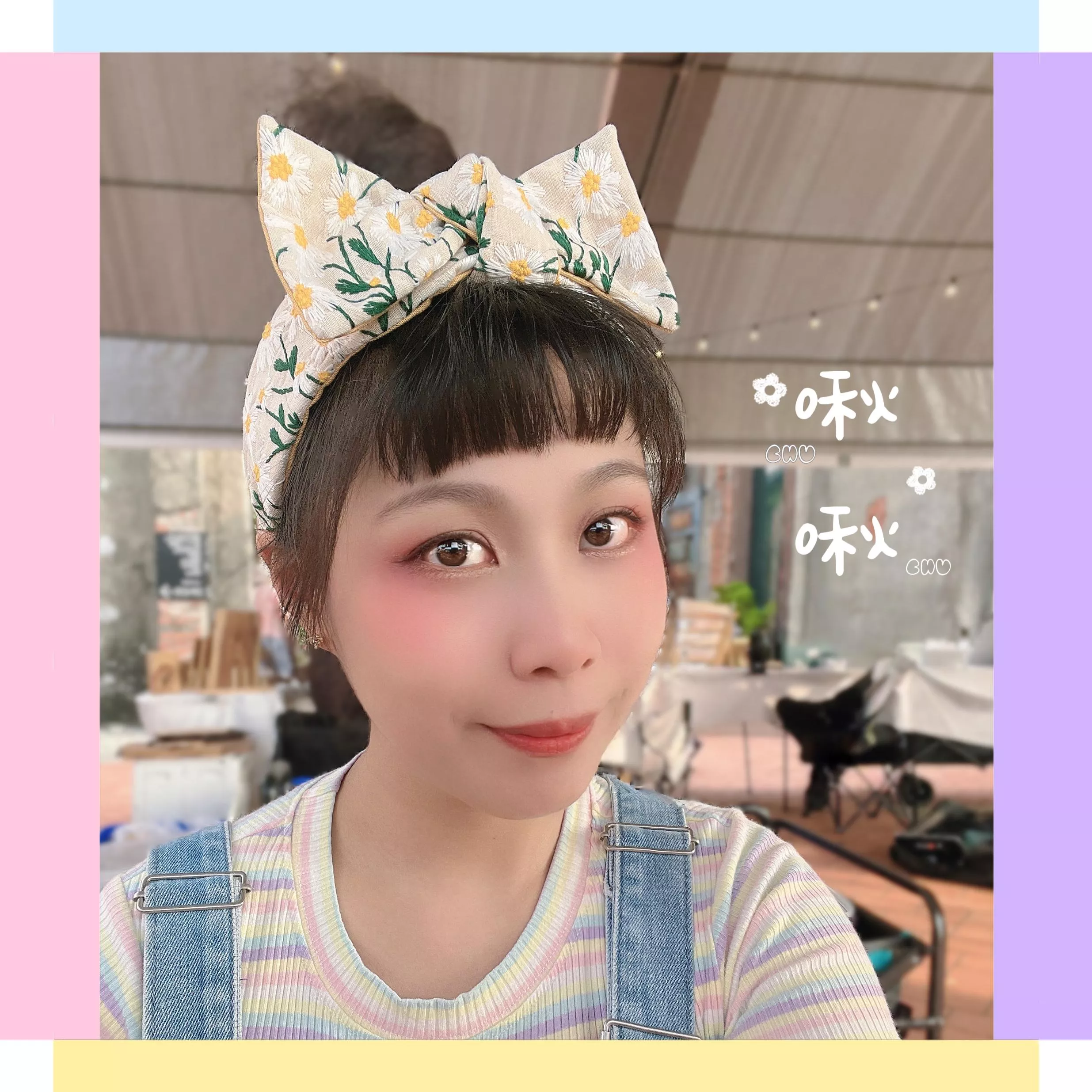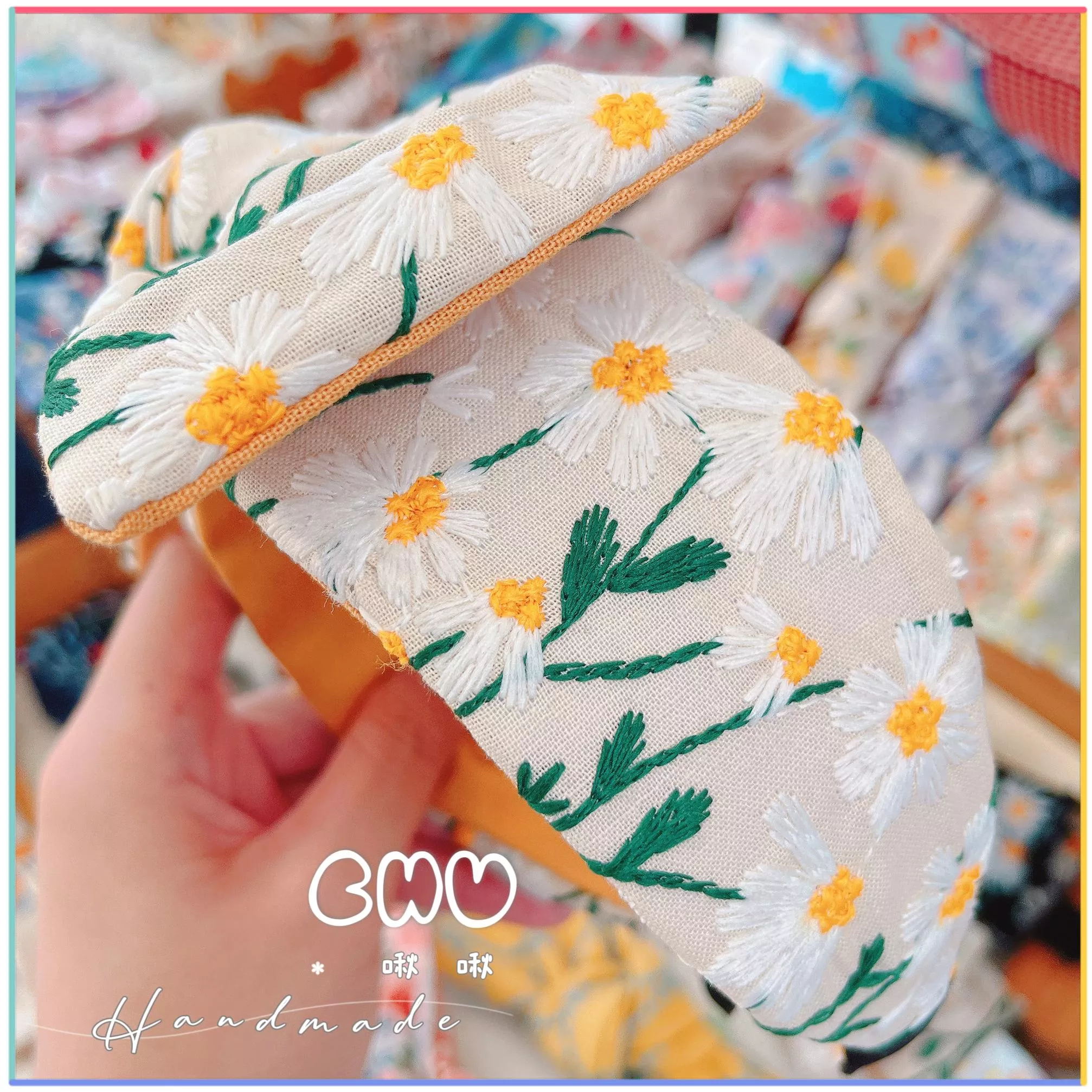刺繡款|滿版雛菊花花(米白色)|寬版 蝴蝶結髮箍