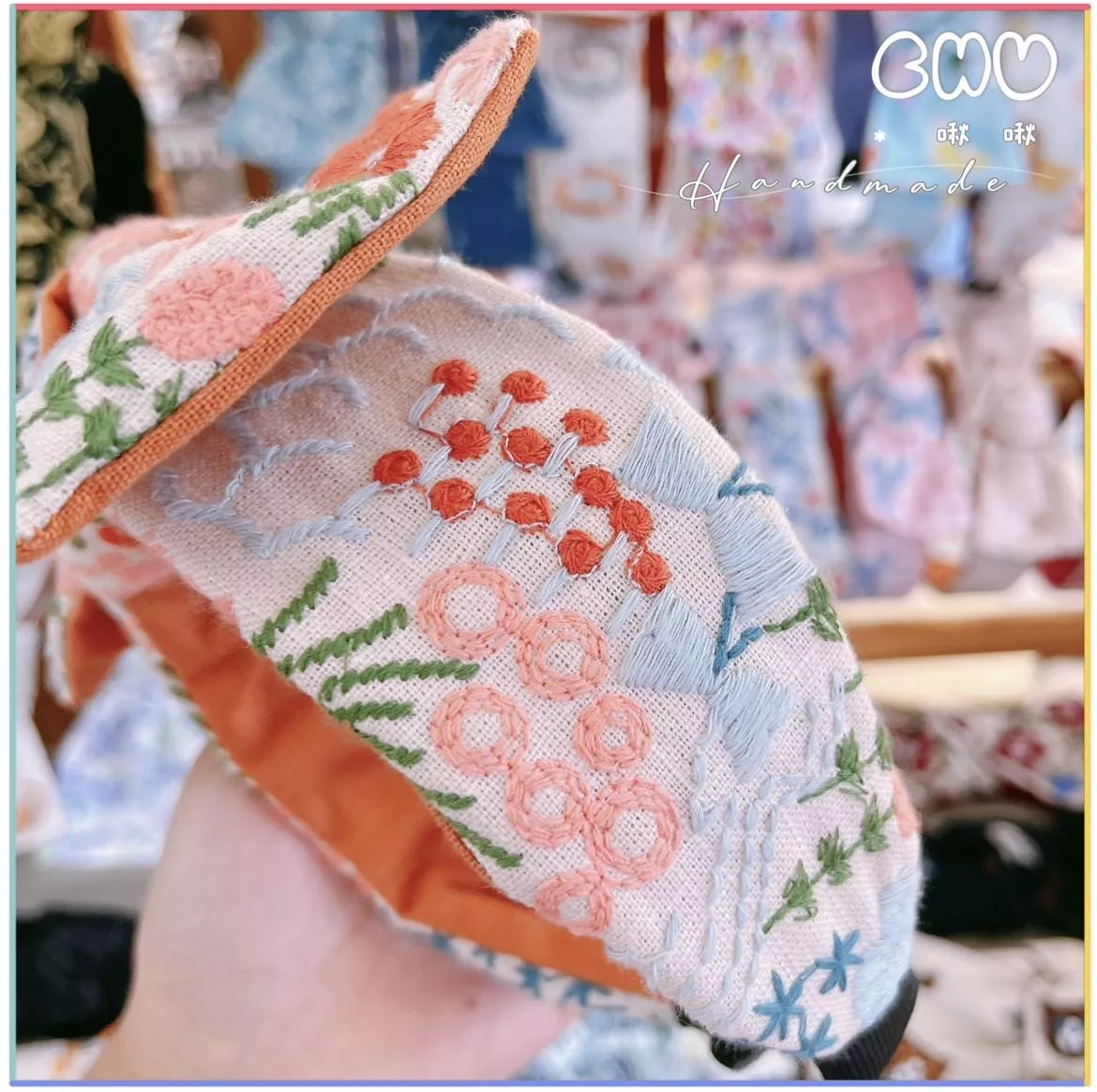 刺繡款|橘色花花(米白色)|寬版 蝴蝶結 髮箍