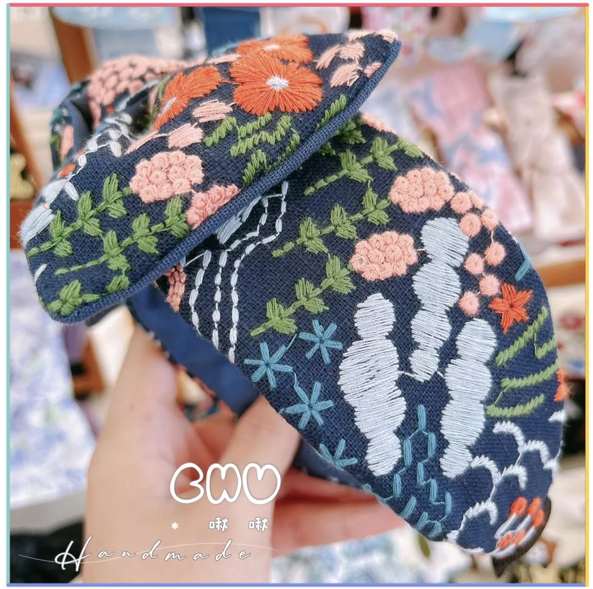 刺繡款|橘色花花(深色)|寬版 蝴蝶結 髮箍
