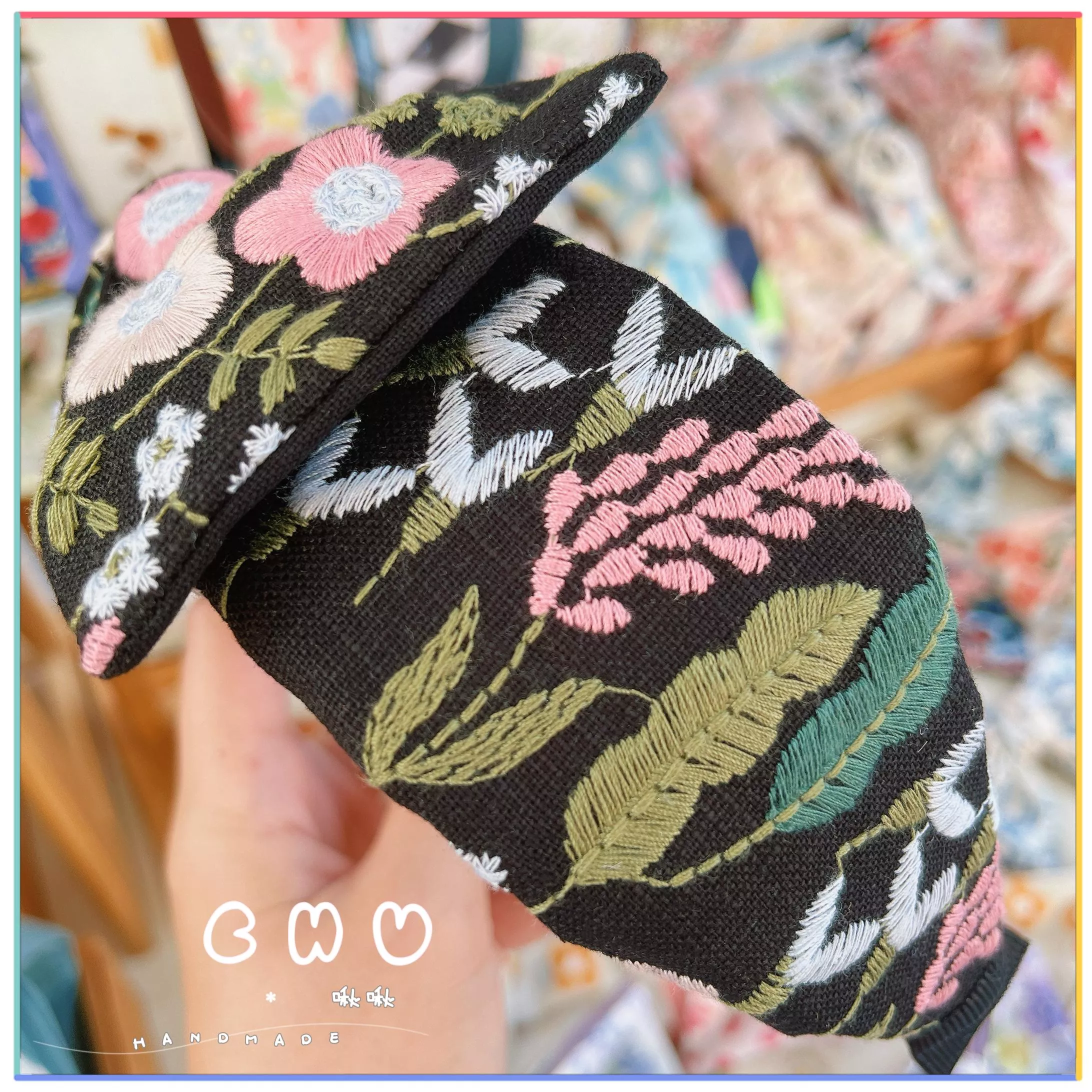刺繡款|粉紅花朵(黑色)|寬版 蝴蝶結 髮箍