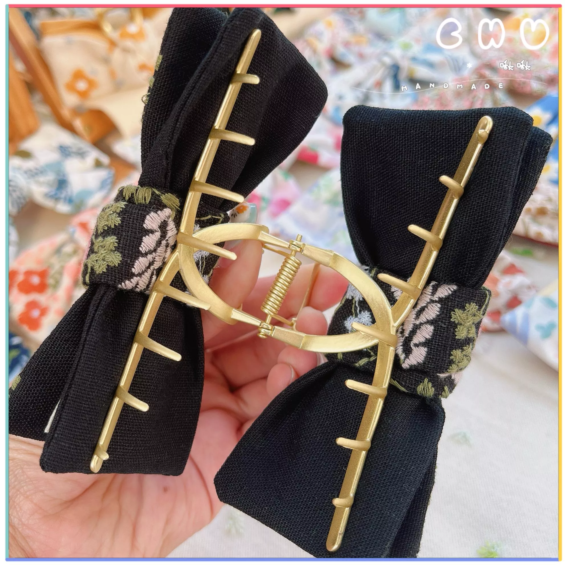 刺繡款|粉紅花朵(黑色)|鯊魚夾 (抓夾)