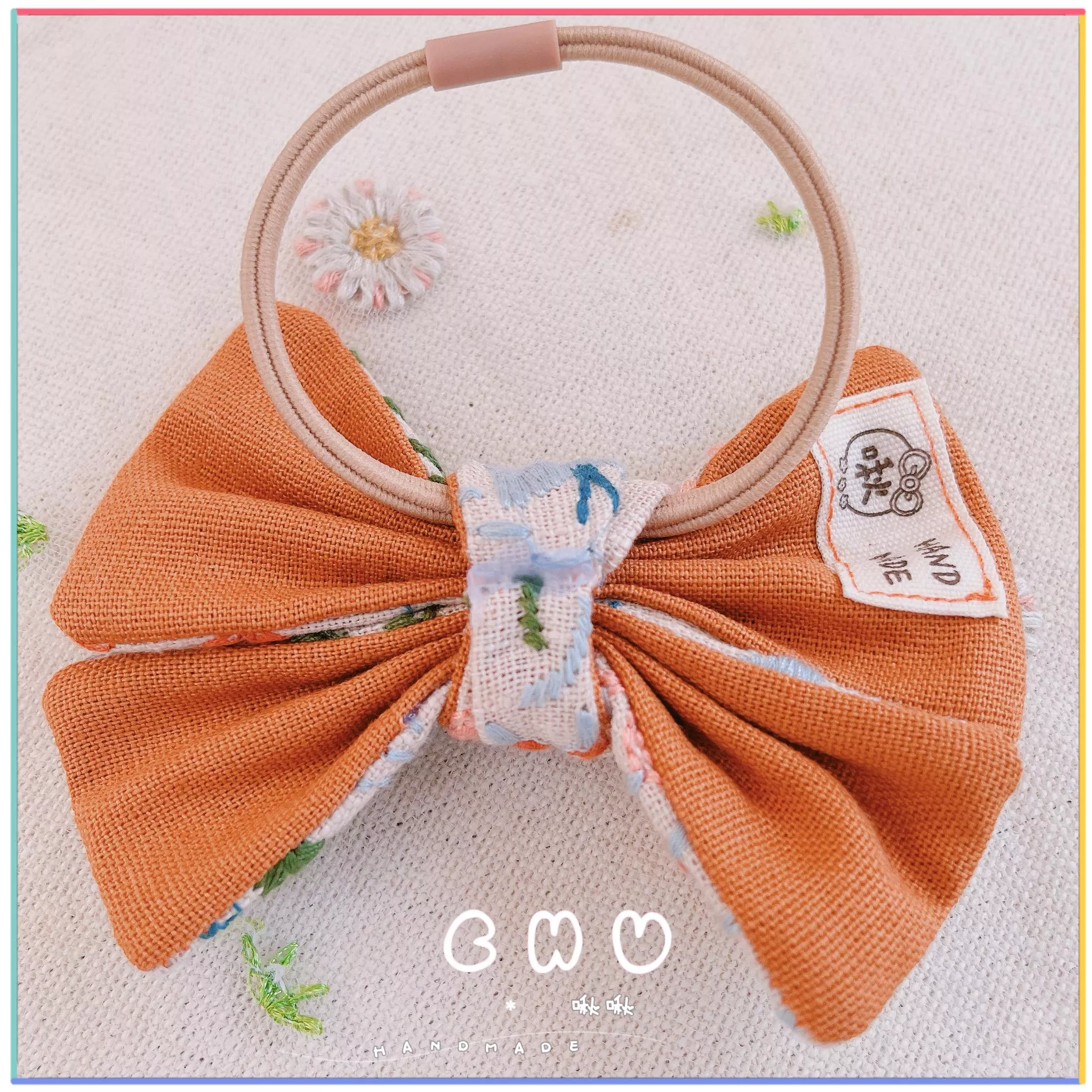 刺繡款|橘色花花(米色)|綁綁 小髮圈
