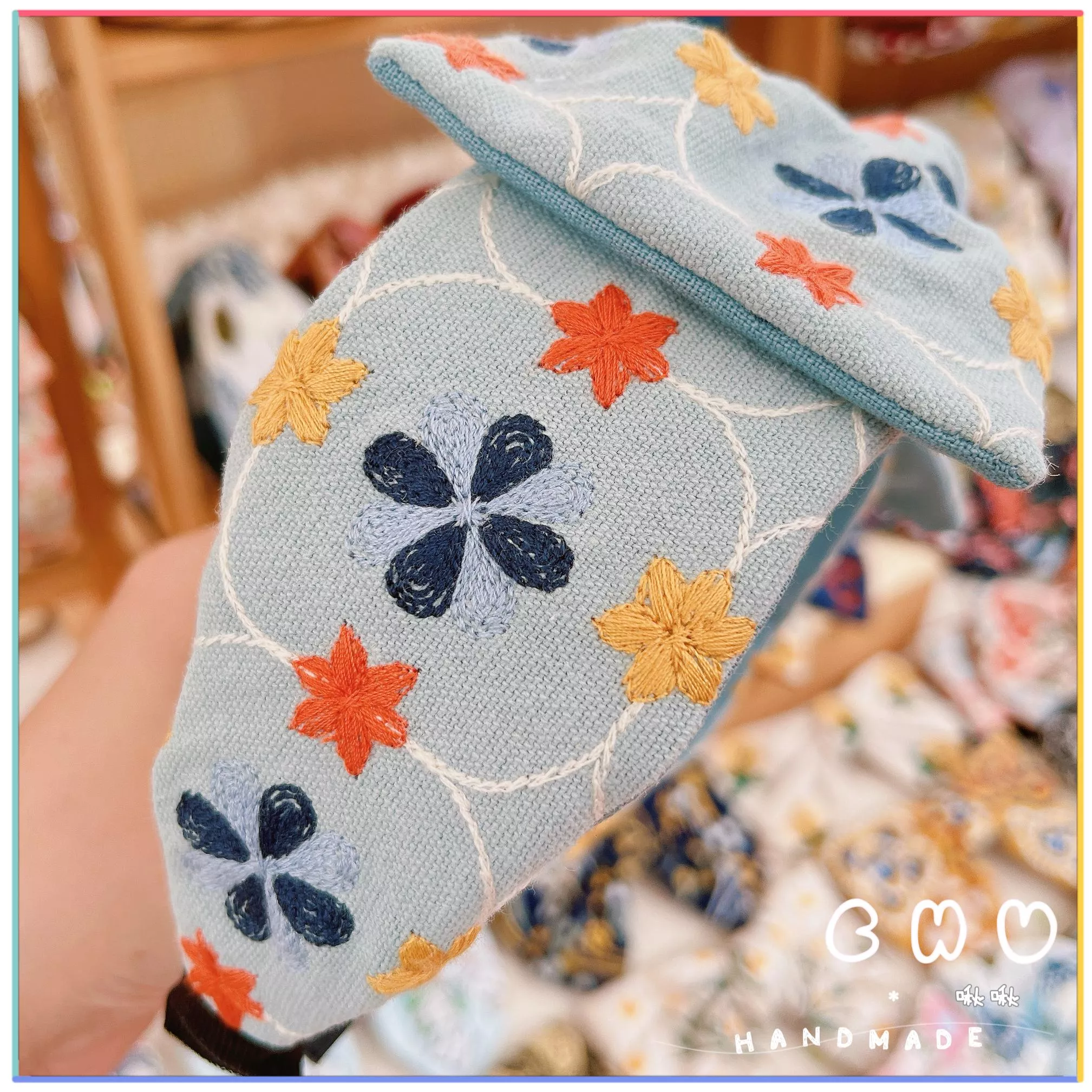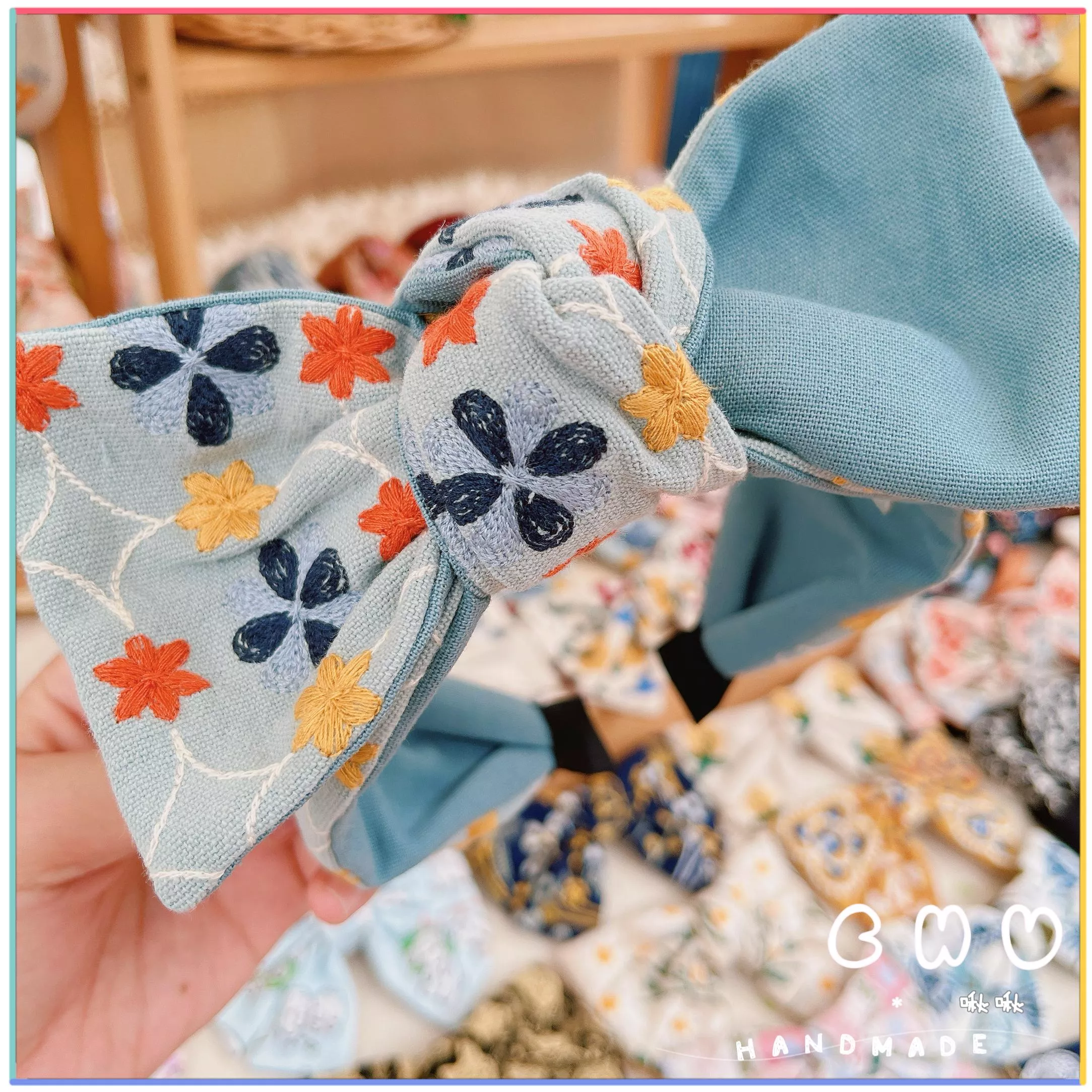 刺繡款|花磚 (天空藍)|寬版 蝴蝶結 髮箍